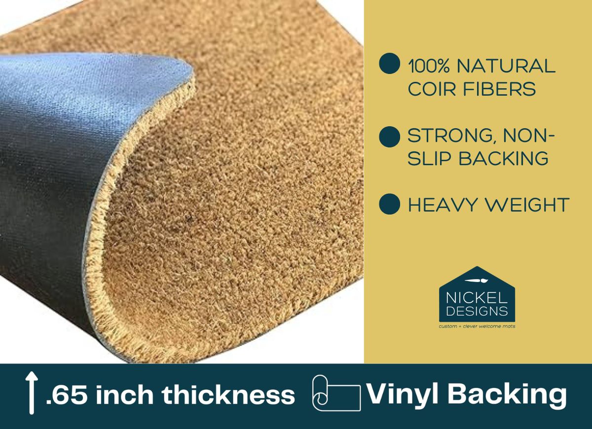 Care Info: Though we use all weather ink and a UV sealant to ensure that your mat is perfect for your doorstep, we suggest that you keep your mat as dry as possible to avoid darkening of the fibers. To clean, simply sweep…easy as that!