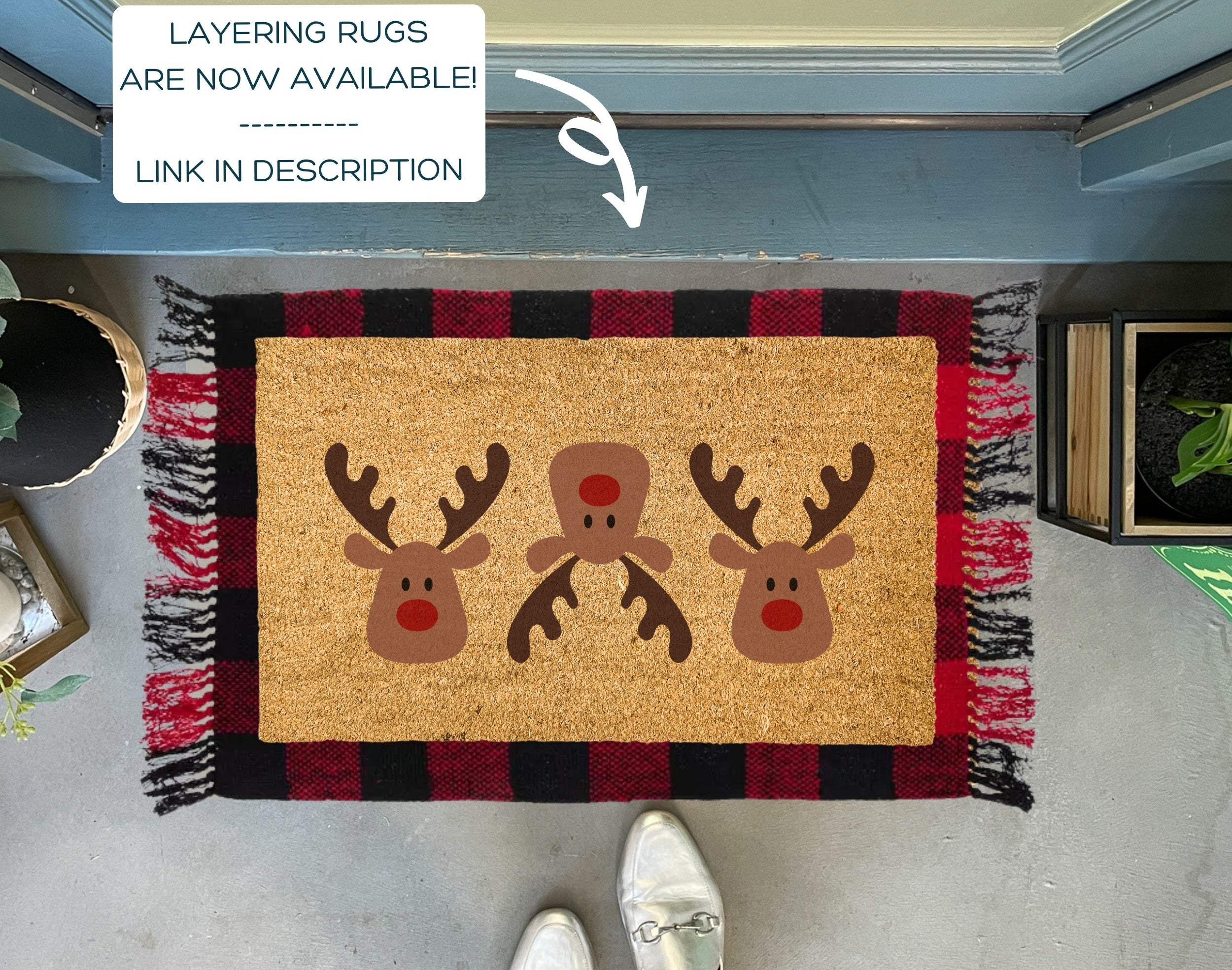 Bring festive cheer straight to your doorstep with our Reindeer Faces Christmas Doormat! Featuring three adorable reindeer with bright red noses, this handcrafted coir mat captures the magic of the holiday season.