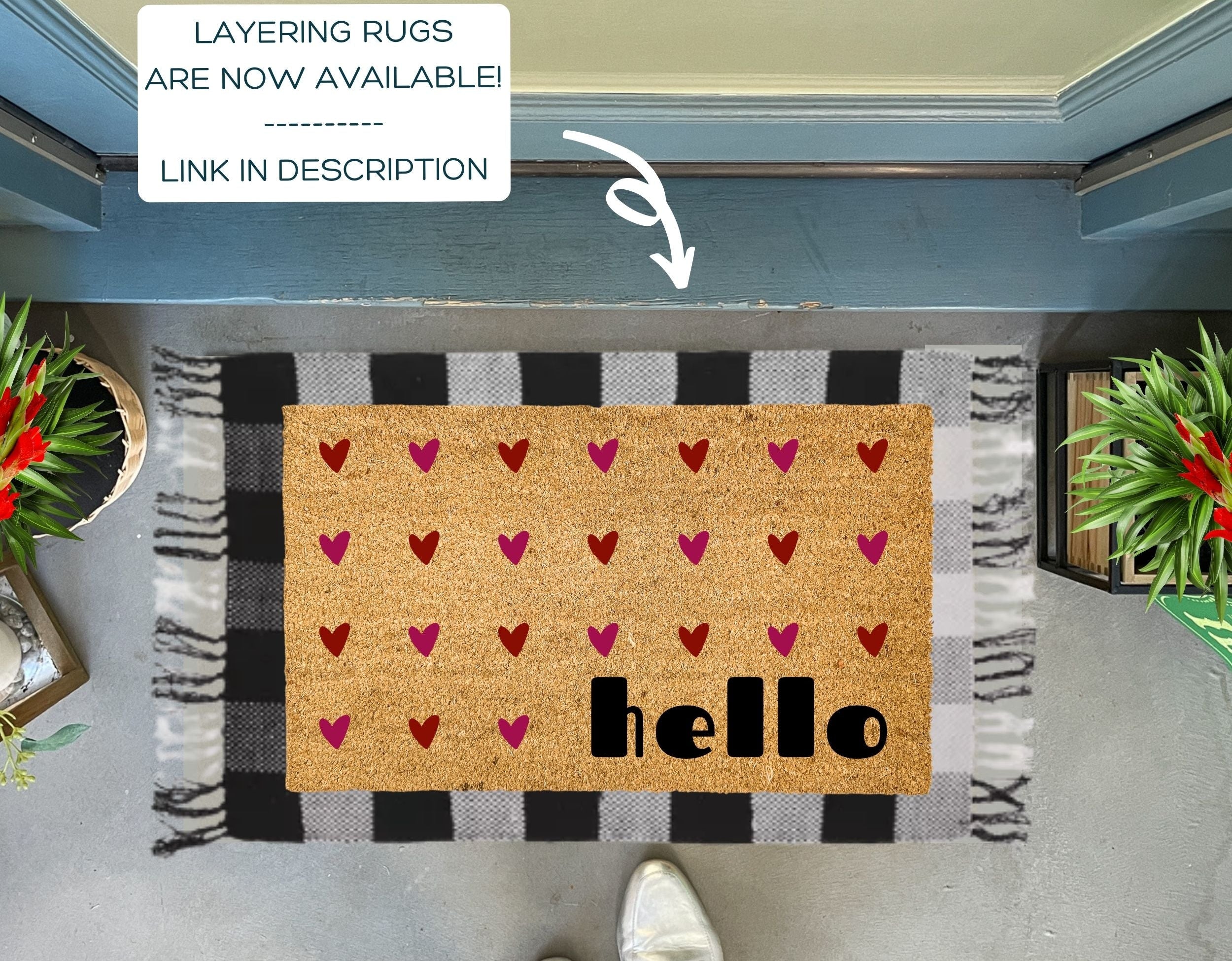 This Valentine’s Day coir doormat features red and dark pink hearts with retro black “hello” text in the corner. A fun seasonal welcome mat that adds a playful touch to your entryway for February and beyond.