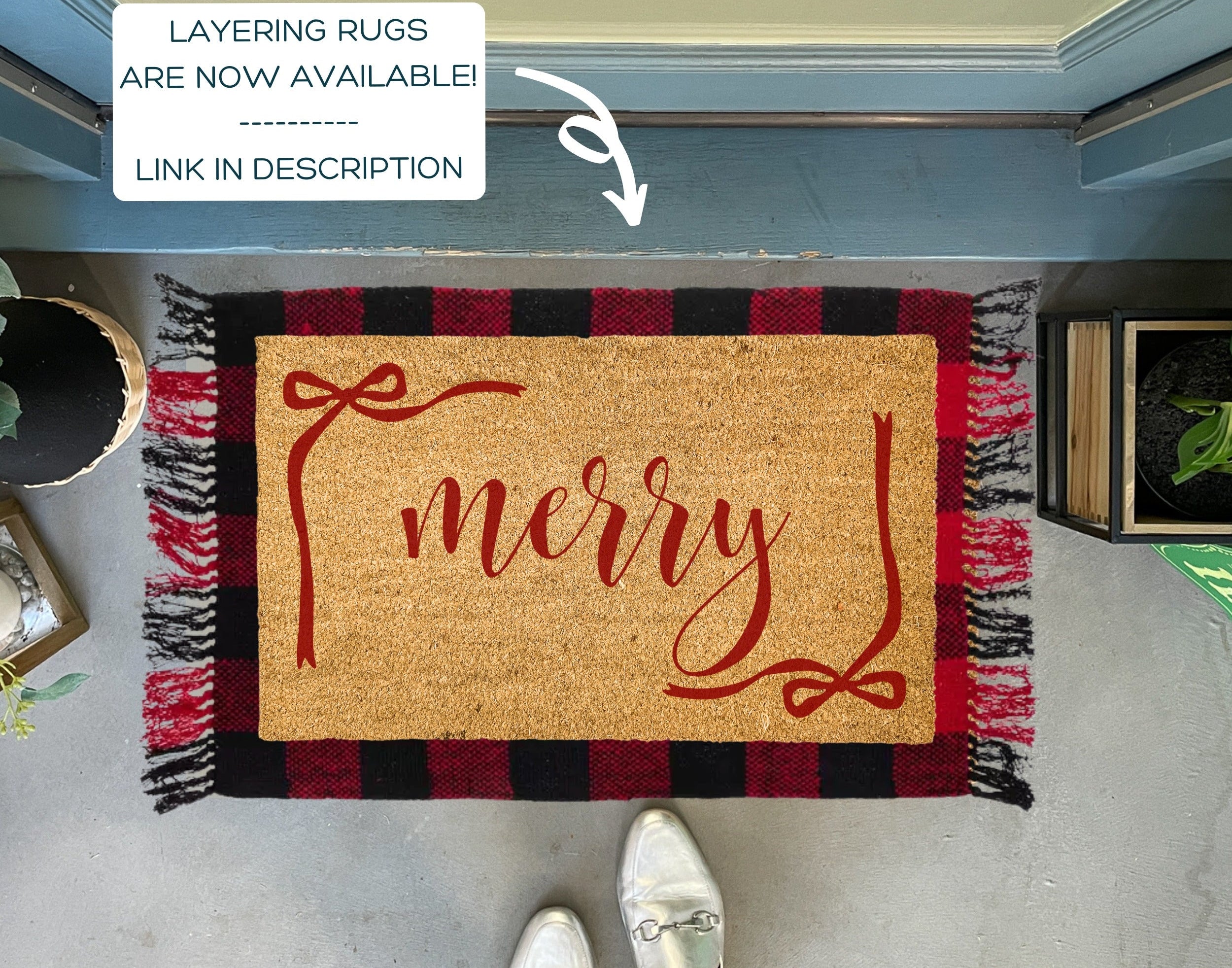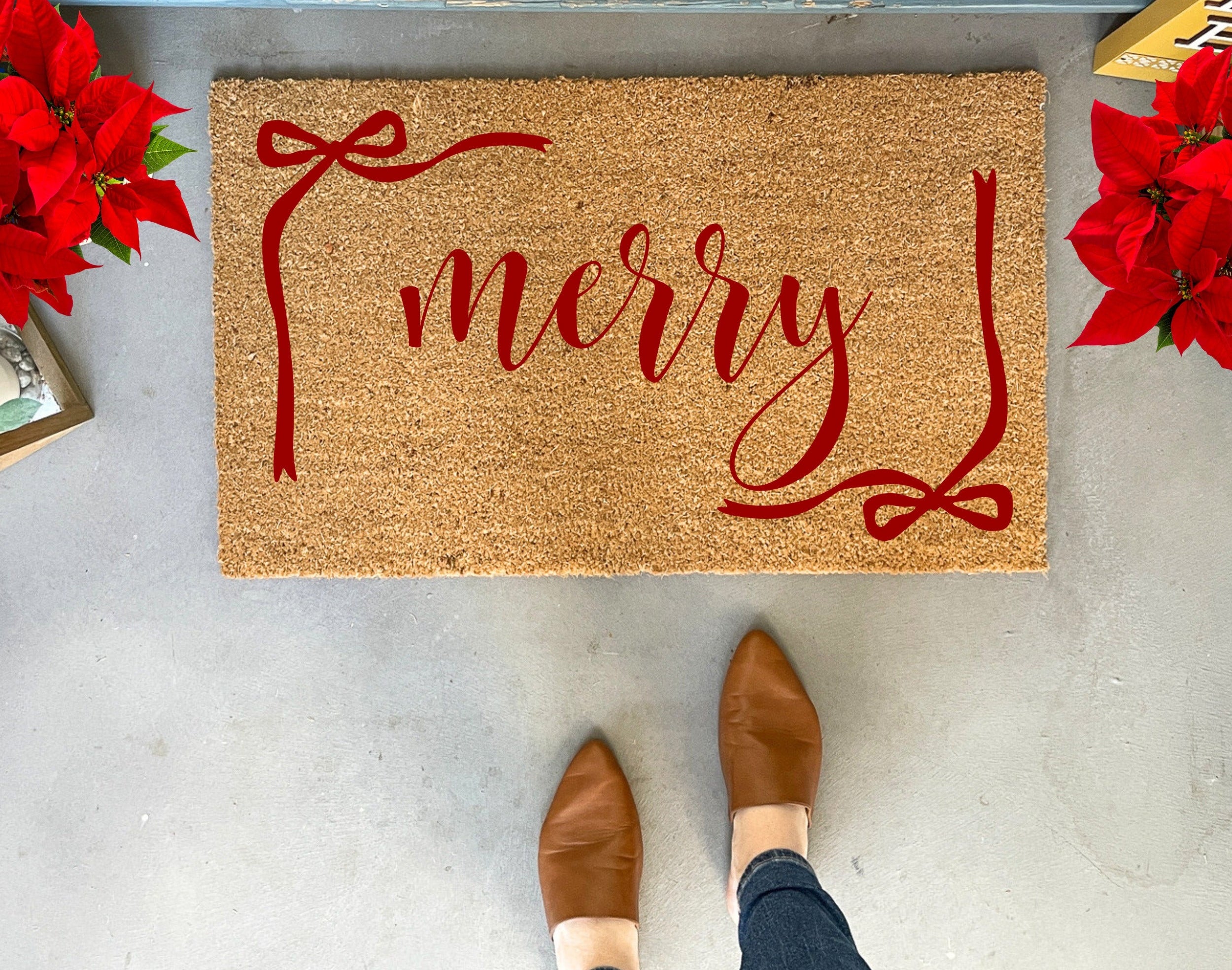 Add a charming touch of holiday cheer to your porch with our Merry Christmas Doormat featuring elegant red ribbons in each corner and festive script text that reads “merry.” Inspired by the trendy coquette aesthetic, this handcrafted coir doormat blends timeless holiday style with a playful, feminine twist.