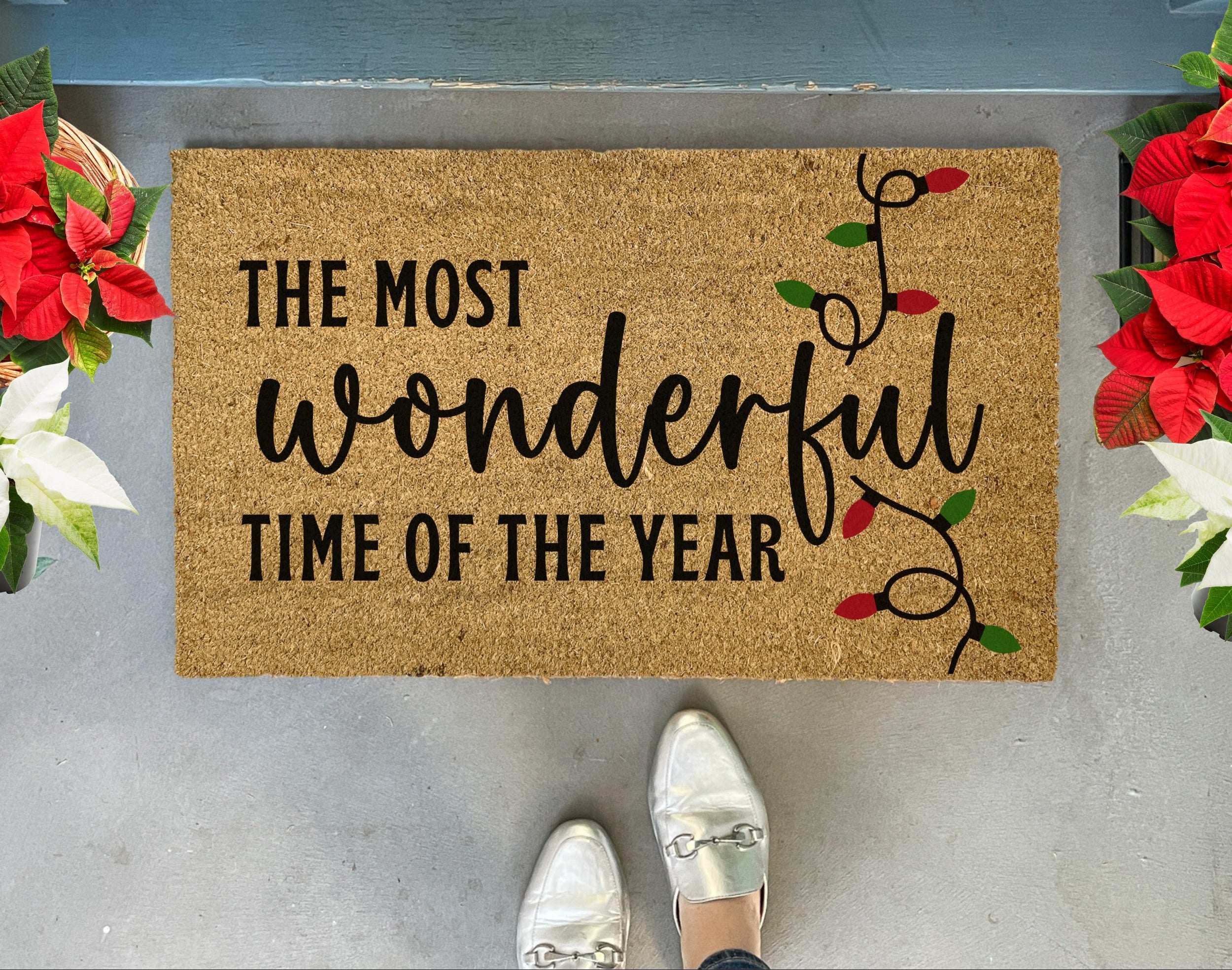 Celebrate the joy of the season with our “The Most Wonderful Time of the Year” Christmas Doormat - a festive favorite for your front porch! Featuring bold black text and a cheerful string of red and green holiday lights, this handcrafted coir mat adds a cozy, welcoming touch to your entryway. *not real lights*